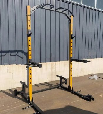 This sturdy steel half squat rack, finished in black and yellow, is a space-saving piece of freestanding strength training equipment. It facilitates compound exercises and includes adjustable hooks for the barbell, robust safety spotter arms, and a versatile pull-up bar. Integrated storage pegs near the base help organize weight plates and enhance stability. Key Features: 1. J-hooks These are the…